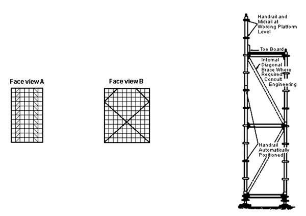 Two typical face bracing patterns used for systems scaffolding are illustrated below. The functioning of the braces is to prevent column buckling and scaffold structure sway, provide resistance to wind and retention mechanisms through tie backs and/or brace stiffening. End bracing is desirable for all systems scaffold structures.