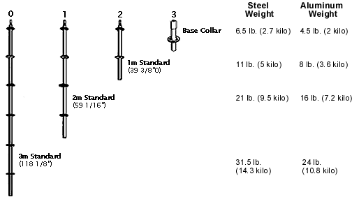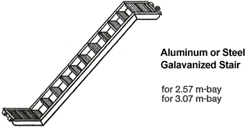 Mills modular Versa stair system uses six standards for the core and three for each of two ends for landings. Aluminum stringers at 2.5 lb. per ft. each have attachment options either by hooks seating on the transom or by a mouthpiece connector attaching to the rosette of the standard. Aluminum treads are 7″ ventilated at 1.5 lb. per ft. or T-slot plank 9.5″ wide and 2.8 lb. per ft. with non-slip safety grip tape.